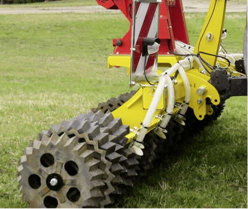 3 - Régénérateur de prairie combiné GK pour l’entretien des prairies, le sursemis et le nouveau semis d’herbes que ce soit sur terrain plats ou escarpés. Combinaison de dents de 12 mm ou 10 mm d’épaisseur et d’un rouleau suiveur.