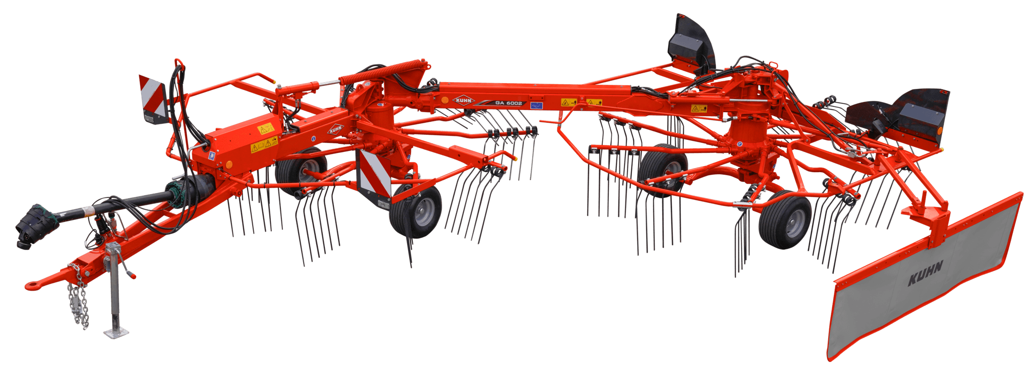 L'andaineur double rotors GA 6002, à dépose latérale, andaine sur une largeur de 3,00 m à 5,80 m en un ou deux andains. Utilisez cette machine avec un tracteur de faible ou moyenne puissance sans problème.