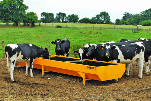 Une gamme d’auges peintes renforcées fabriquées en tôle d’acier plié d’une grande rigidité et destinées pour une alimentation en fourrage et ensilage aux bovins.