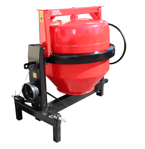 Gamme de bétonnières agricoles à basculement latéral par volant, pour micro-tracteur ou tracteur allant de 180 à 430L, avec 2 à 3 pâles de malaxage.