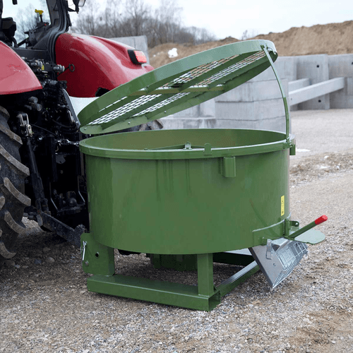 Attelage sur chariot élévateur. En fonction du modèle, la puissance requise de 40 cv à 120 cv et le diamètre de remplissage de 1 200 mm à 1 880 mm et avec un débit en une heure allant de : 7 m³ à 15 m³