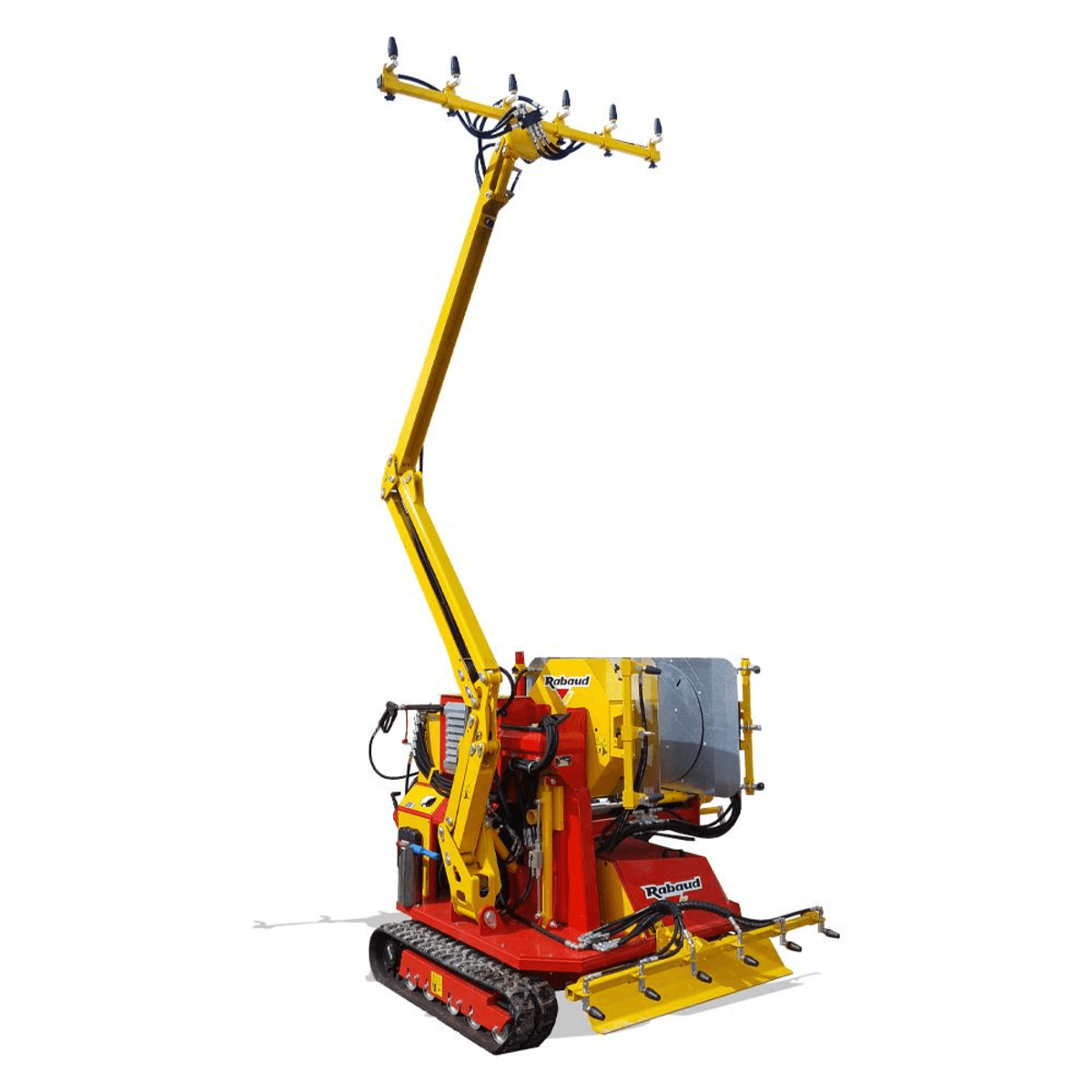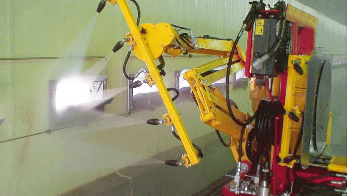 - Une rampe orientable montée sur un bras articulé qui peut atteindre 5 m de haut pour le lavage du plafond et des parois.