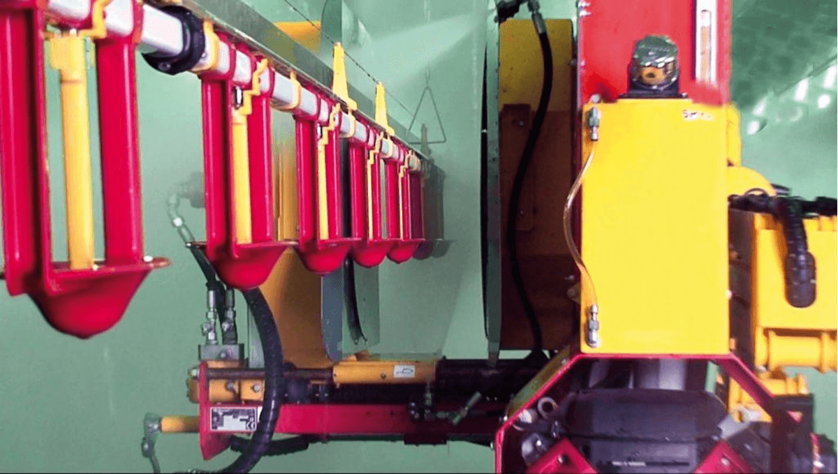 Avec un groupe haute pression posé à l’extérieur du bâtiment avec cuve tampon de 1000 litres en même temps qu’une vanne de vidange avec enrouleur de tuyau HP, longueur 100 mètres, une pompe haute pression de 140 bars et de 87 l/min de débit. Moteur thermique essence 22 ch. Rampe 1,58 m avec 6 rotabuses.