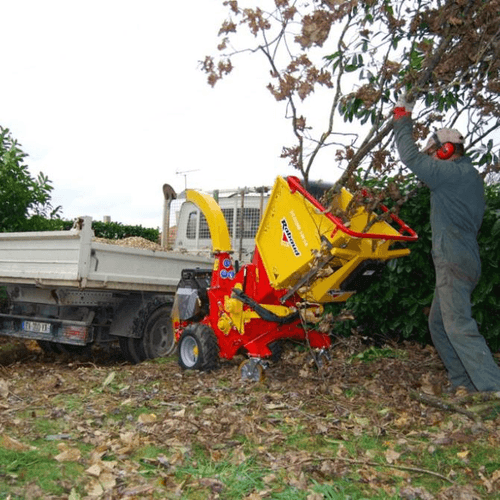 Broyeur à déplacement autotracté grâce aux 2 roues commandées hydrauliquement pour un diamètre de branche de 110 mm. Machine sécurisée : Barre de sécurité 4 positions et arrêt d'urgence avec bouton de réinitialisation.