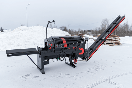 Combiné bois de chauffage, pour tracteur +/- 40 cv, diam. de coupe 36 mm, longueur de coupe de 25 à 60 cm, fendeuse 9T, commande manuelle, fendeuse ultra rapide, tapis d'évacuation orientable à chaîne, commande manuelle, réglage manuel de la hauteur du coin, temps de cycle très court.