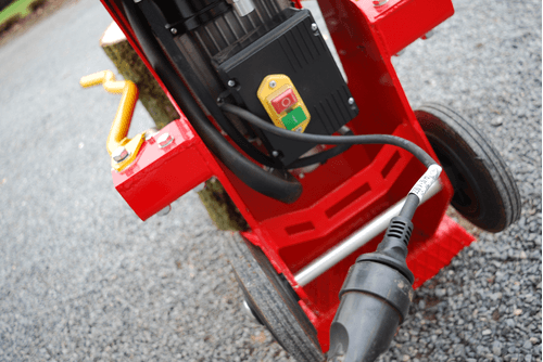 Coin tranchant en acier haute résistance, 2 roues de transport. Commande bimanuelle à double vitesse avec point neutre et remontée automatique du coin.