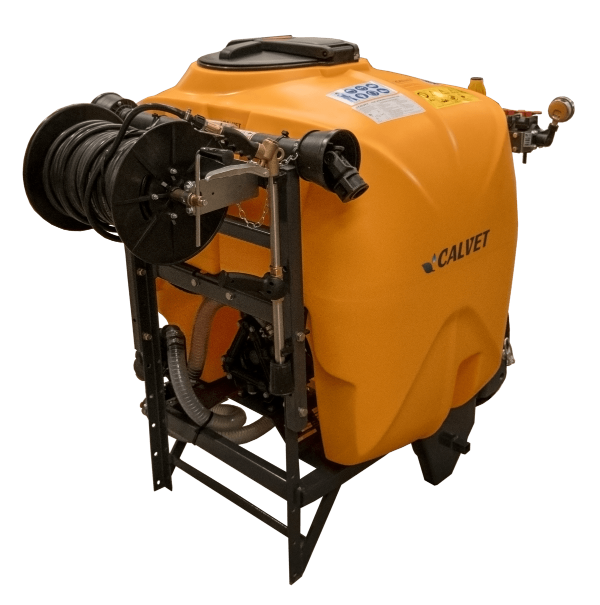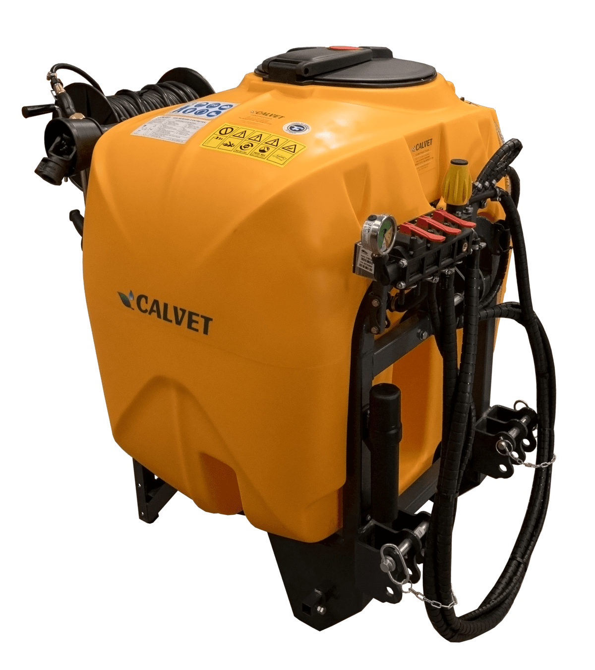 Châssis tubulaire, bac polyéthylène 400L, cuves lave-mains et rinçage indépendantes, pompe polypropylène 85L/min, 20bar 3 pistons membranes, filtration 3 niveaux, 3 sections manuelles, régulation manuelle, manomètre D/100, brassage par retour principal, vanne de vidange, attelage 3 points double chape, cardan de série, enrouleur, tuyaux 50m, lance.