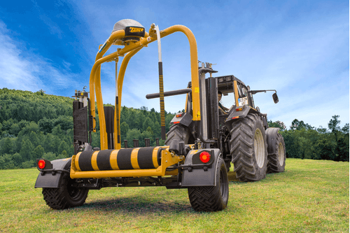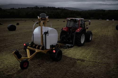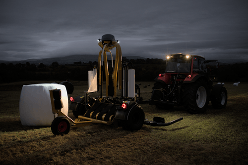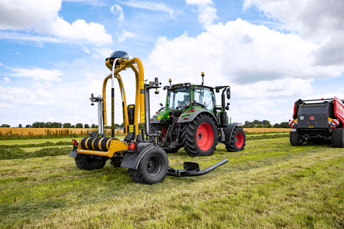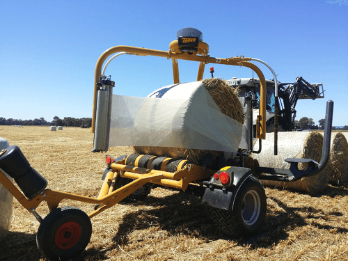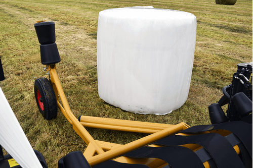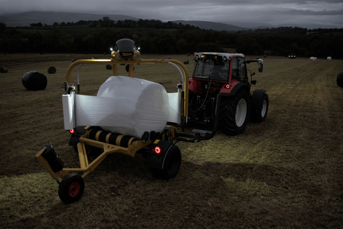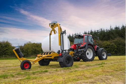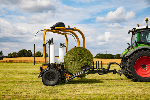 Enrubanneuse traînée double satellites, chargement dans le sens d'avancement de la presse. Table d'enrubannage fractionnée permettant un chargement et un déchargement simultanés de la balle. Ø de balle jusqu'à 1,5m et poids maxi 1 400kg.