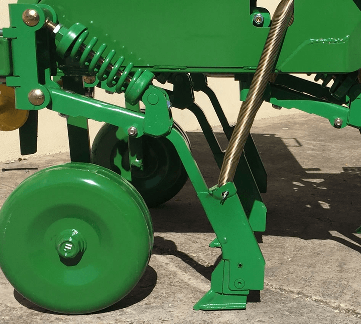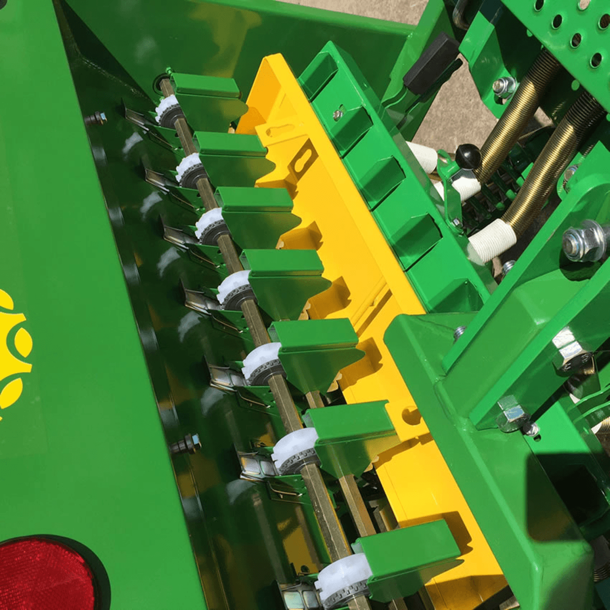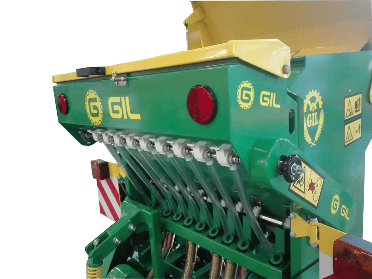 Semoir à vignes mécanique direct à soc en tungstène en T inverse, distributeur à ergot double pour les graines fines et les grosses graines, plateau de pesée, tubes de descente à ressort en métal, herse à dents, variateur de vitesse, contrôle de la profondeur par les roues, passerelle de remplissage, indicateur du niveau de grain, feux de transport. Capacité de la trémie de 130 L à 355 L selon les semoirs. Choix d'équipements pour toutes les utilisations.