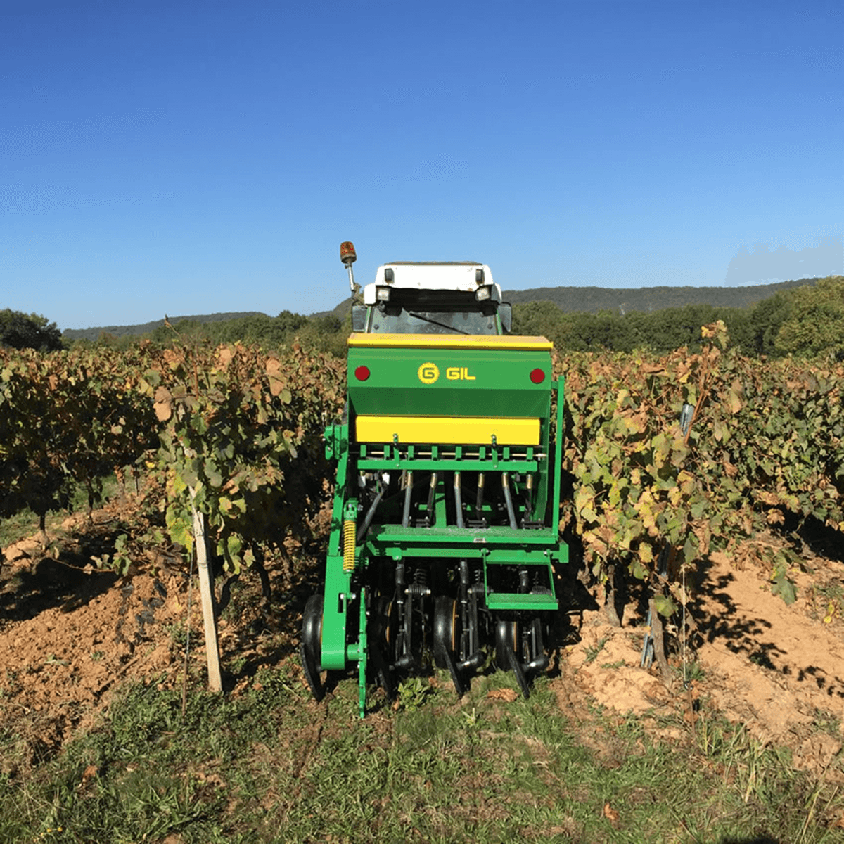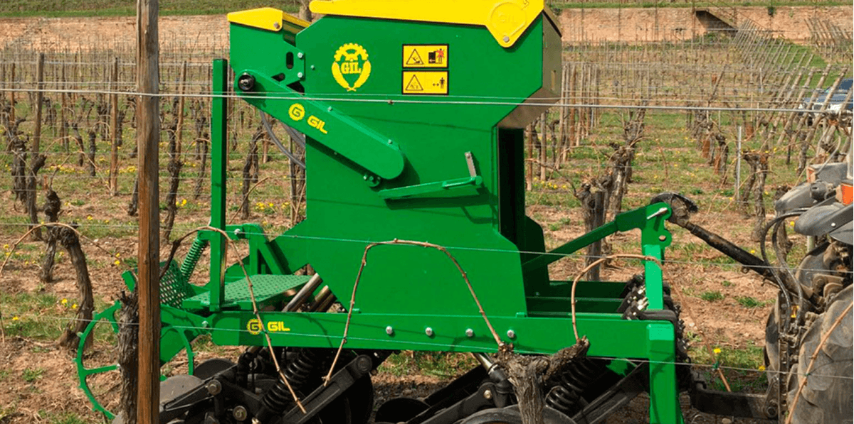 Semoir mécanique direct pour vignobles, système à disques avec roue tasseuse en caoutchouc et roue pour fermeture du sillon, variateur de vitesse, distributeur à ergot double pour les graines fines et les grosses graines, plateau de pesée et passerelle de remplissage. Contrôle de la profondeur indépendant à chaque disque, tubes de descente télescopiques, indicateur du niveau de grain, feux de transport. Capacité de loua trémie de 330 L à 780 L selon les semoirs. Choix d'équipements pour toutes les utilisations.