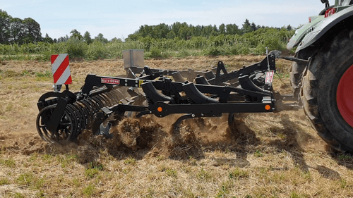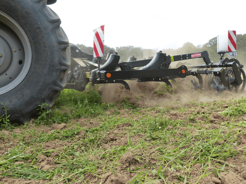 Petit déchaumeur à dents porté BEARCUB châssis tripoutre 100 x 100 mm et 3 rangées de dents type Blackbear avec socs, à sécurité non-stop ressort, hauteur 720 mm et dégagement sous châssis 850 mm. Ecartement entre dents 300 mm et entre barres 700 mm. Rangée de disques niveleurs type FLEAU 450mm montés sur sécurités élastomères 40 mm, réglage mécanique des disques de nivellement et de la profondeur de travail. Rouleau Z de 500 mm de diamètre.