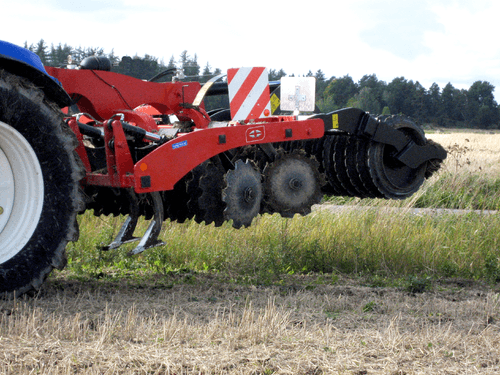 Il permet en un seul passage de déchaumer, décompacter, mulcher et ré-appuyer grâce à une combinaison dents et disques.