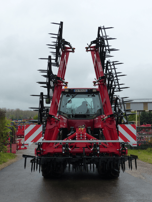 2 - Herse HVSL est un modèle lourd équipé de dents mangano-siliceux de 28 mm, longueur 280 mm qui conviennent aux sols les plus durs. Châssis bipoutre 100 x 100 jusqu’à 6,3 m et tripoutre à partir de 7,3 m.