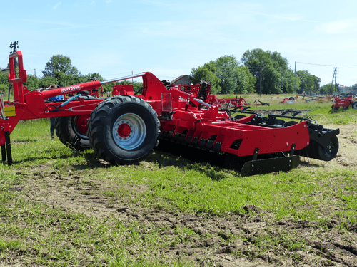 2 vérins de relevage avec butée de profondeur hydraulique, distance entre rangées de disques 900 mm, dégagement sous châssis 500 mm, reliage par 2 vérins avec verrouillage mécanique, déflecteur anti-projections sur parallélogramme, réglage mécanique de la profondeur de travail par le rouleau arrière, freinage hydraulique et de stationnement