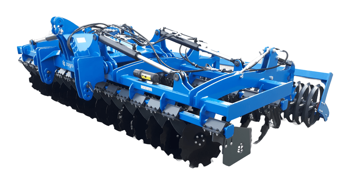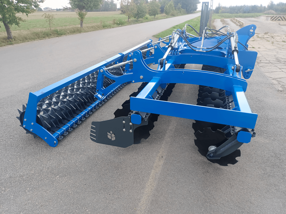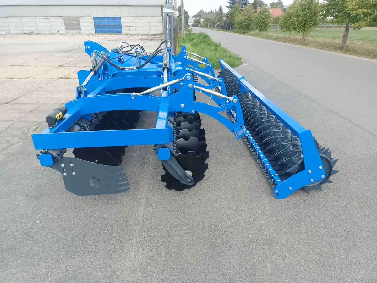 2 rangées de disques diam 560mm, sécurité amortisseurs caoutchouc, déflecteurs latéraux réglables en hauteur, éclairage, terrage hydraulique, rouleau barre diam 600mm.