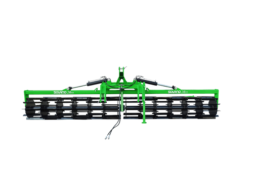 Conçu avec un châssis en tube structurel de 100 x 100 x 8 mm, un rouleau de Ø 600 mm avec lames d'usure de 60 x 10 mm (matériel anti-usure), un attelage tracteur réversible (avant ou arrière), support fourni pour atteler des masses de contrepoids. Attelage de catégorie III. Ailes fixes ou repliables hydrauliquement pour les 2 modèles les plus grands.