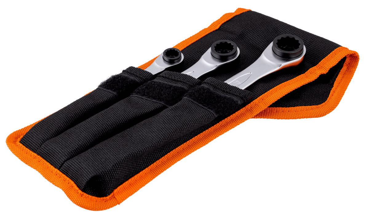 3 pièces avec étui. Profil Dynamic-Drive™ 12 pans pour une plus longue durée de vie des vis et écrous. Finition chromée micro-mate pour une protection anti-rouille de haute qualité. Alliage d'acier haute performance. 4 tailles par clé : 1 clé est utilisable pour 4 tailles de vis. Utilisation plus facile dans les espaces restreints avec un angle de travail de 5°.