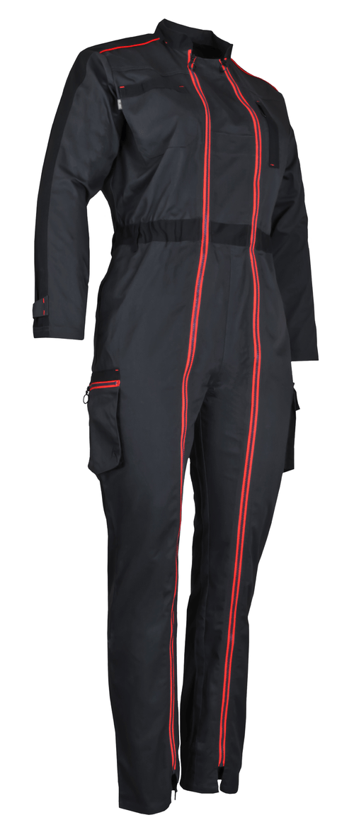 Col officier, 1 poche poitrine avec ouverture verticale zippée, 1 poche plaquée au dos, 1 poche mètre insérée avec la poche cuisse, 1 poche plaquée, élastiquée côtés et dos, 2 poches avec passe-mains, 2 poches cuisse à soufflet, passepoil fluorescent, système easy feet. Tailles 1 à 5.