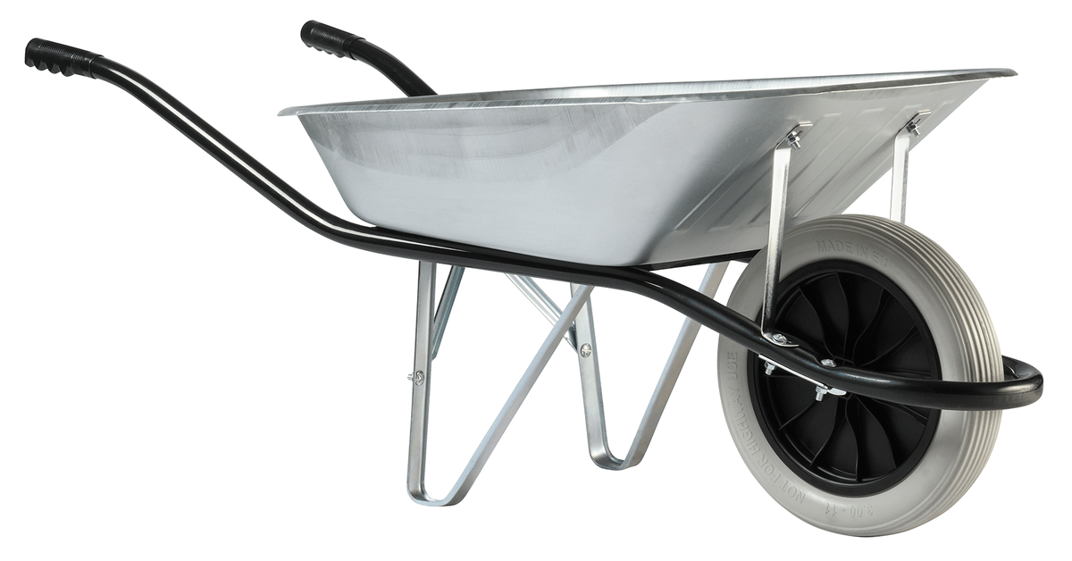 Caisse galvanisée. Traverses soudées sur le châssis. Bord replié et doublé. Roue gonflée.