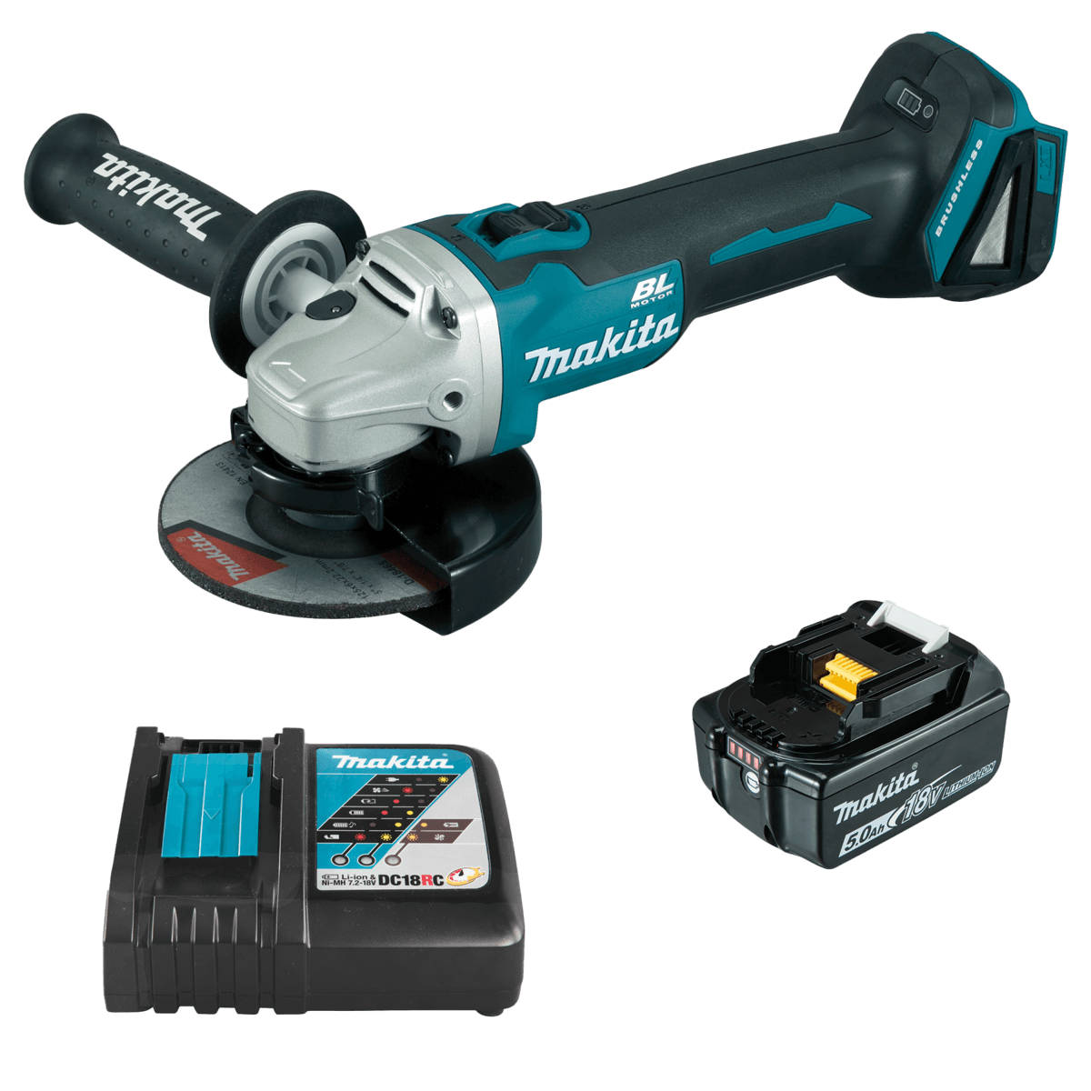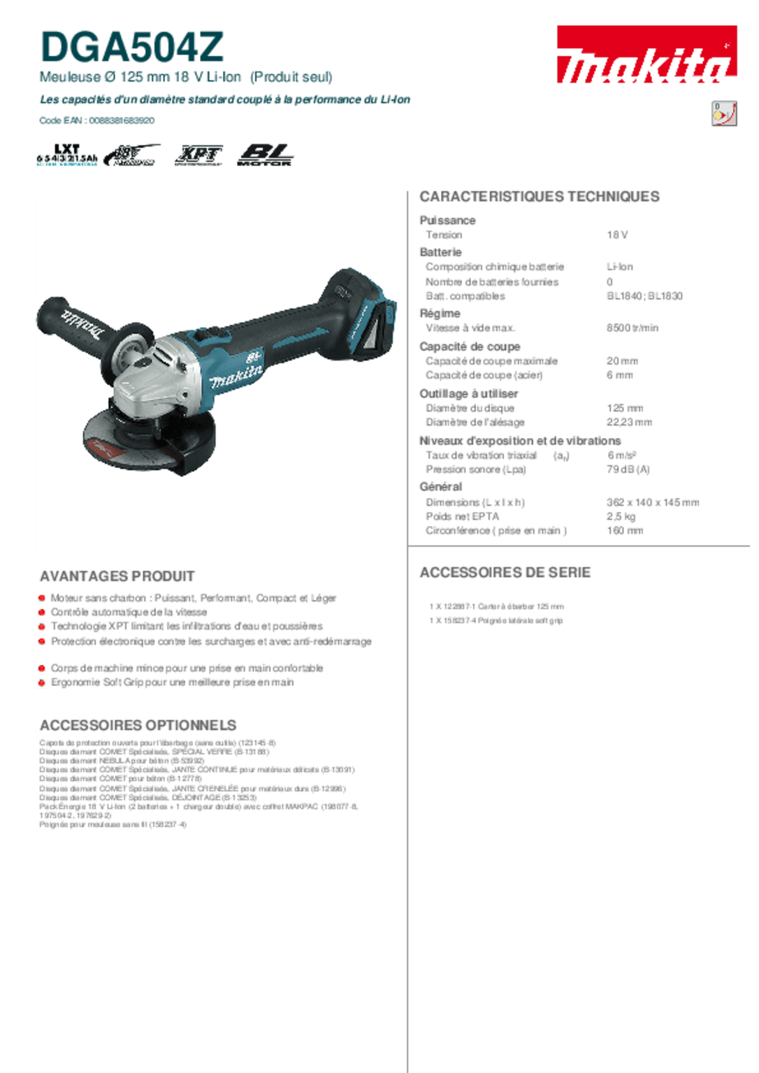 Diamètre disque : 125 mm. Diamètre alésage : 22,23 mm. Régime à vide : 8500 tr/min. Poignée à revêtement Soft Grip pour plus de confort. Livrée avec : carter à ébarber 125 mm, batterie LXT 5 AH et chargeur rapide Makstar.