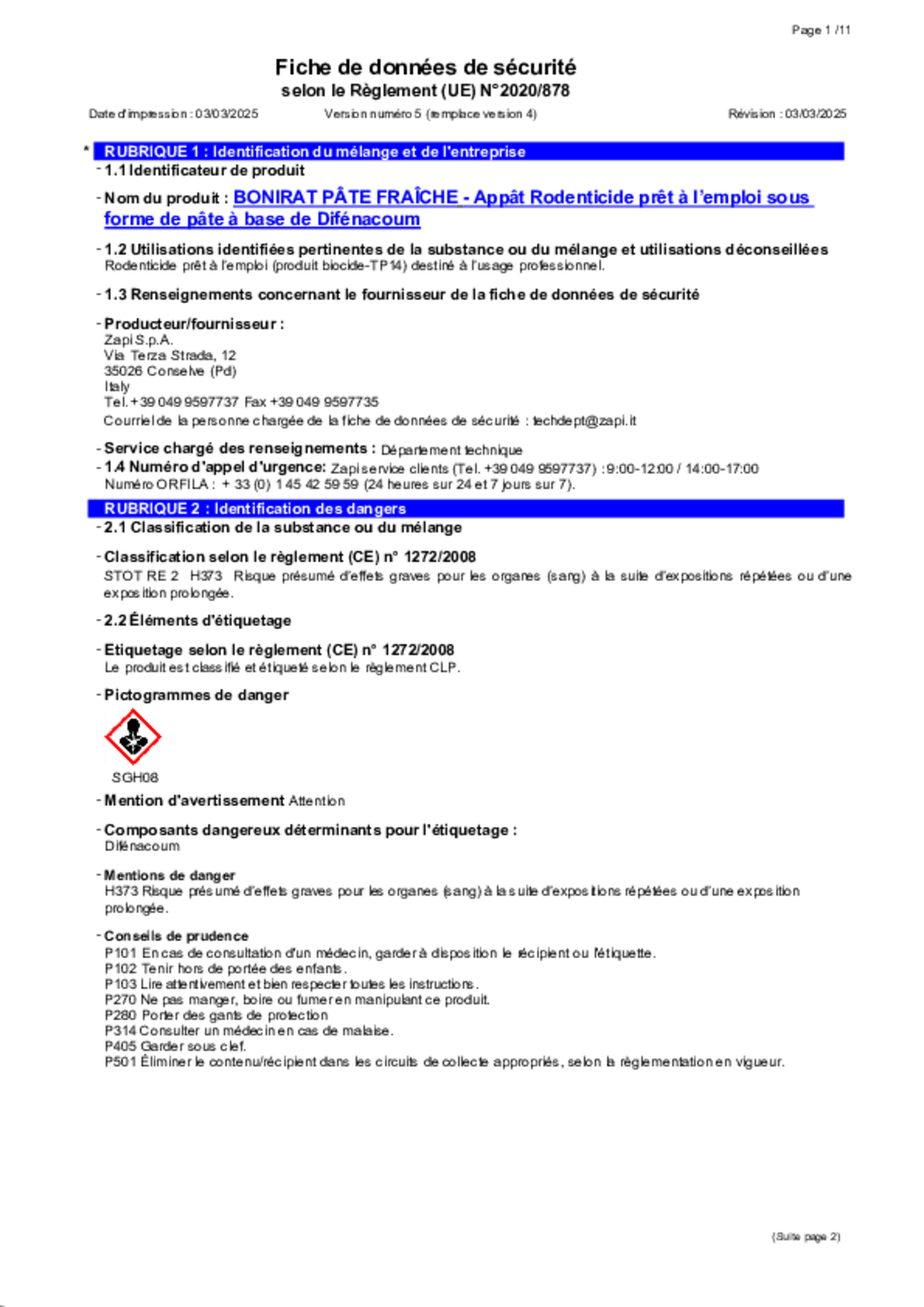 Raticide. TP 14-Rodenticide prêt à l'emploi. Composition : Matière active, Brodifacoum à 27 ppm (meilleure...